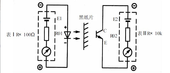 采用“雙表法”檢查光電開關的電路如圖2 所示。為避免外界光線的影響,應盡量在暗處檢測光電開關。具體方法是:將表Ⅰ撥至R×100 Ω 檔向發射管提供正向電壓,表Ⅱ置于R×10 kΩ 檔測量c-e 極間電阻。把黑紙片放在發射窗與接收窗中間,用來阻擋紅外線。上、下抽動紙片時應觀察到表Ⅱ指針有明顯的擺動。在測試條件不變的情況下,指針擺幅愈大,說明器件的靈敏度愈高。