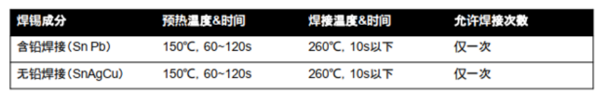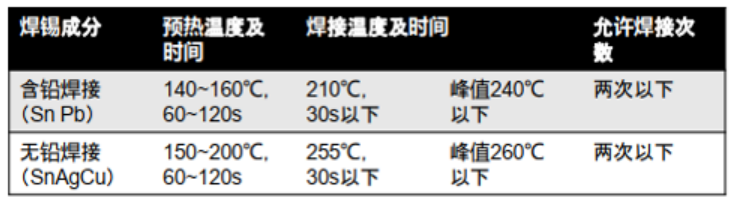 手工焊:350攝氏度:3秒內(nèi)或者260攝氏度:10秒內(nèi),注意僅可焊接一次。