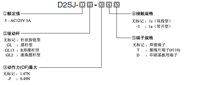 D2SJ-5 超小型基本開關 高安全而又可靠的超小型基本開關 外形尺寸與SS系列相同。 適應未來市場需求。 備有5A型產品。