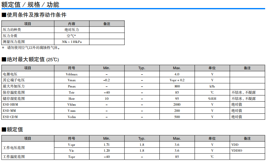 高精度·低消耗電流的小型MEMS絕對壓力傳感器 高精度地測量氣壓 內置低干擾的24bit ADC 基于I2C/SPI 接口的數(shù)字控制/輸出 在自動睡眠模式下實現(xiàn)低消耗電流 單獨的補償系數(shù)保存在OTP*中 (* One Time Programmable - ROM)